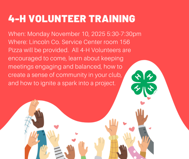 Calling All 4-H Volunteers! We Need your representation on the Lincoln Co. 4-H Leaders Assoc. Not a Volunteer? It’s easy to join!